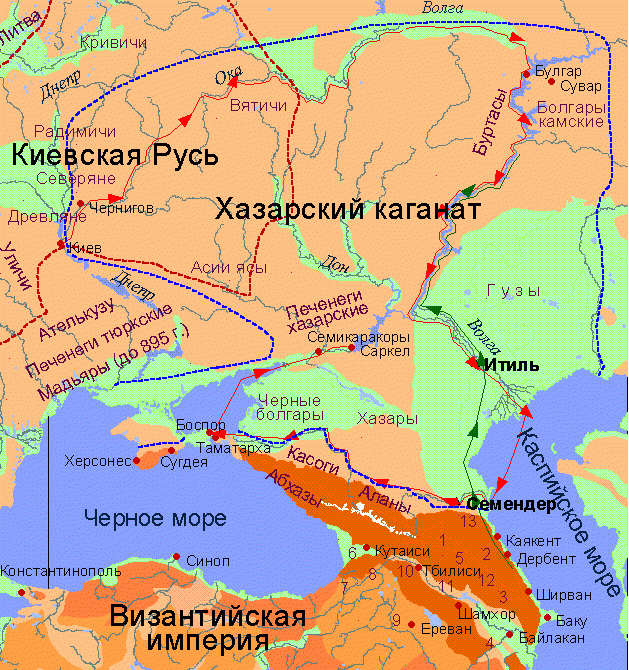 Хазарское государство с самого начала своего существования утвердило контроль над важнейшими торговыми путями из Восточной Европы в страны Передней Азии. Уже это показывает, какую роль для Хазарии играла транзитная торговля. Одним из самых важных, если не важнейшим, был путь вдоль западного берега Каспийского моря, к устью Волги, затем вверх по этой реке. Приблизительно в районе нынешнего Волгограда он разветвлялся на два: один продолжался вверх по Волге, другой через Переволоку переходил на Дон. Оба пути в VII - первой половине Х в. контролировались хазарами. Вверх по Волге купцы должны были миновать страну буртасов и достигали Булгара Волжского, где уже в IX в. существовала торговая фактория и где встречались мусульманские купцы с русскими.